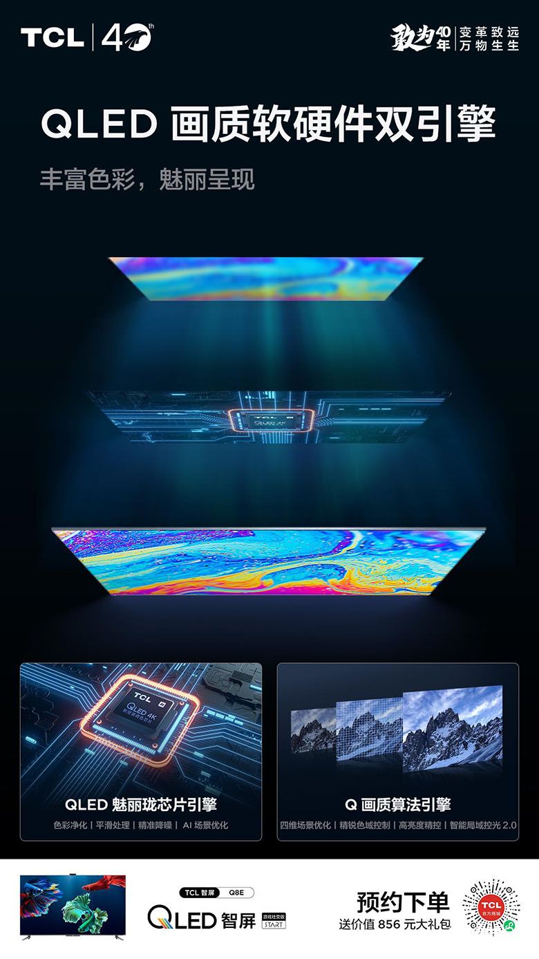 此外,电视画质芯片也是考量电视屏幕的一大重点,当信号传输到电视上时,它能够对其中的影像信号和图像进行处理和修复。在清晰度,降噪,色彩增强,亮度控制,运动补偿等方面起到至关重要的作用,Q8E搭载了TCL的QLED魅丽珑芯片引擎以及Q画质双引擎,拥有AI场景优化、四维场景优化、智能局域控光等多重技术对画面进行专业调校和深度优化。