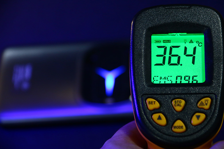 我们通过玩几款游戏来实际测试一下手机的温度,王者荣耀、QQ飞车、和平精英和穿越火线分别一局游戏玩下来,在手感上并没有以往烫手的感觉,可以说是接近皮肤温度。我们使用红外温度计测试手机背部中央区域,测得温度为36.4摄氏度,这样的表现真的令人满意。