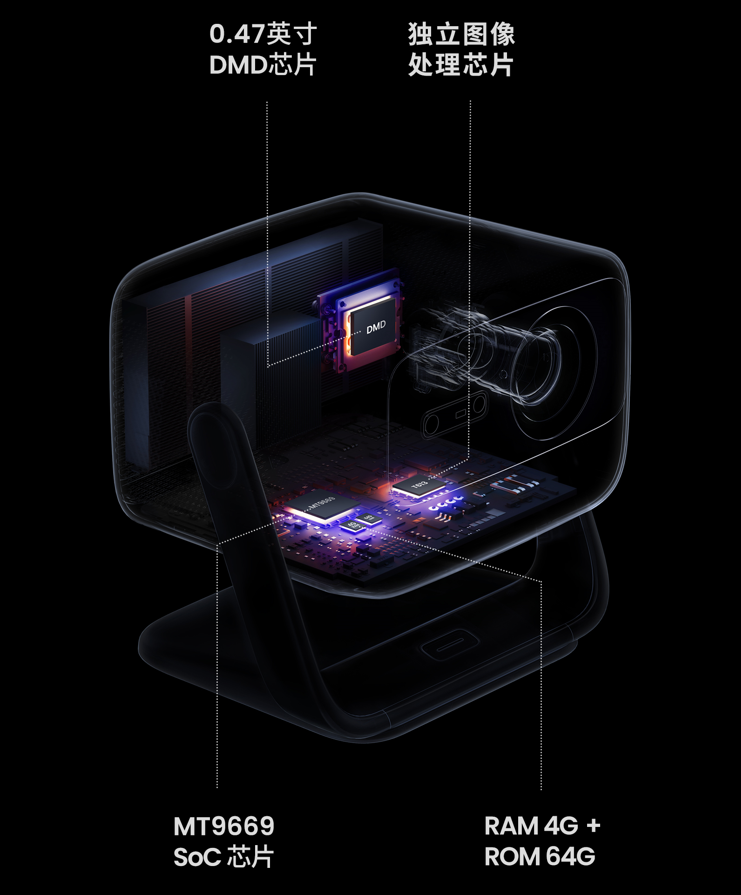 先上硬件配置,N1系列两款投影的DMD显示芯片选择了0.47",一般而言,“底大一级压死人”,芯片直接决定投影仪输出的物理分辨率,尺寸越大,对光的利用率越高,成像效果越好,0.47“是高端机型标配。