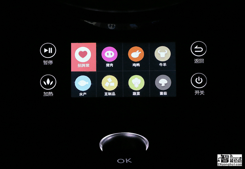 从外观来看,onetouch智能烹饪机采用了黑色和淡紫色的配色设计。外观时尚,颜值比较高。如同很多高端大气的家用电器一样采用了金属拉丝设计,而它整体小巧玲珑。配备一款4.3寸液晶屏幕,内置美的生活电器独家研发的onetouchOS的烹饪系统。在屏幕的周边,一共有四个触摸式按钮,可以用于调节选项。而它的主要键只有一个OK键。也就意味着用户只要选定好需要的菜,一键就可以进行烹饪。