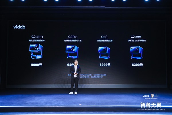 其中,跨代引领画质巅峰C2 Ultra和同代机皇C2 Pro配备了行业首创的0.9~1.5:1超广投射比超级光学变焦镜头,实测亮度高达3000流明和2600流明,画面对比度达2000:1,首发价格分别为11999元和9499元;全能旗舰C2S和质价比之王C2至臻版同样带来了2000流明和1700流明的同价位超高实测亮度,画面对比度达1700:1,首发价格分别为6999元和6399元。Vidda C2 Ultra、C2 Pro和C2S都载了全球顶级音响品牌JBL定制的10W×2高保真音响,使其不仅拥有行业顶级的画质,还拥有了世界级的音响表现。