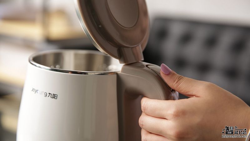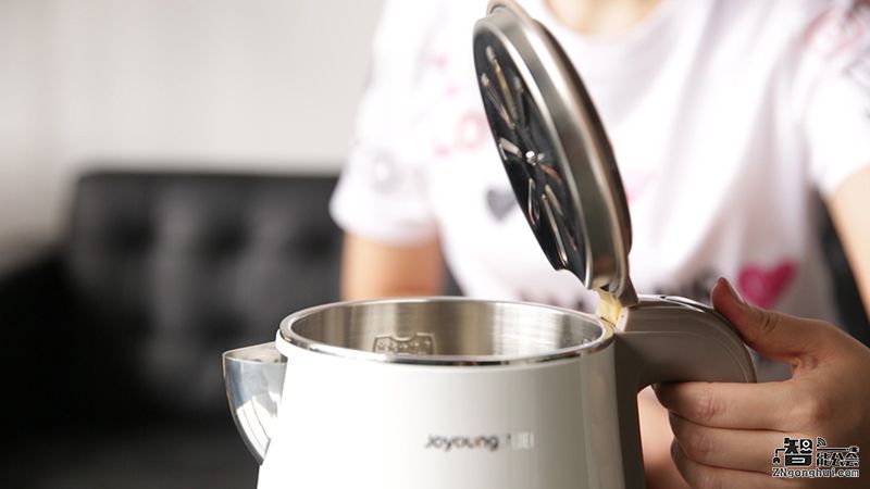 九阳双层电热水壶K17-F618还采用一键开盖,轻轻一按,壶盖自动弹起,非常便捷,壶盖内层采用花瓣形冷凝水设计,处处彰显着时尚设计。打开上盖后,我们发现它的开盖角度非常大(75度)接水方便,而且这样的广口设计还可以方便消费者清洁,一只手可以伸进去清洗。