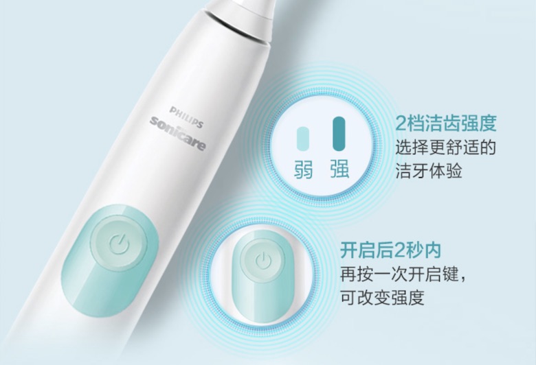 强、弱两档洁齿强度,可根据实际情况进行选择,让牙龈更舒适;智能感应芯片,可以实时感知刷牙力度,若力度过大,手柄震动会改变,提示减小压力;
