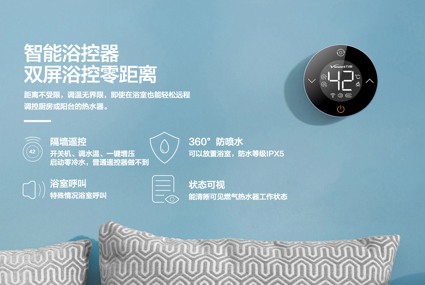 “BANF颁芙”SA系列在智能方面也有独特的创新,搭配万和第二代的智能浴控器Hap-Con C2“小圆点”,具备隔墙遥控、360度防喷水、状态可视和浴室呼叫功能。特别是小圆点搭载的“浴室呼叫”功能,在浴室一键“呼叫”,不仅热水器能声光报警提醒,手机也会同时收到提醒信息的推送,给家人多了一份贴心的保护。“小圆点”也将成为未来浴室空间的智能中控。与此同时,“BANF颁芙”SA系列也是一台IOT智能产品,链接互联网,可实现智能终端APP的远程监控。