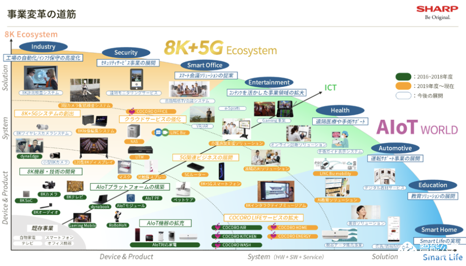具体来说,我们以电视,生活家电,智能手机和商用设备等现有业务为基础,致力于「8K设备和技术的开发」,「AIoT商品的拓展」和「 AIoT平台的建设」。 此外,我们正进行「8K+5G系统的整合服务」,「发展5G相关业务」,「扩展COCORO LIFE服务」和「加强云端服务」。透过横向和纵向的整体发展,夏普将从以往的硬件与设备为主的事业,朝向成为结合软硬件及科技服务的多元系统,以及提供解决方案为主的事业体永续前进。