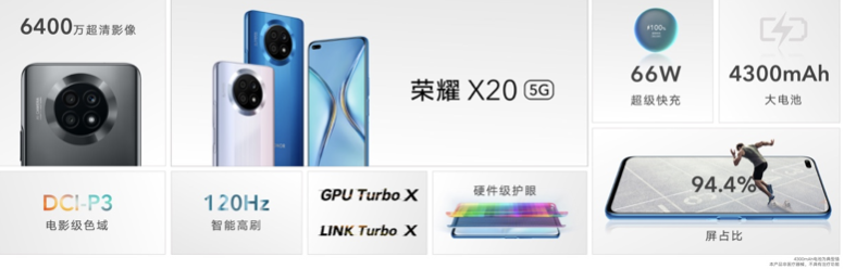 荣耀X20,120Hz超窄边全面屏+66W超级快充