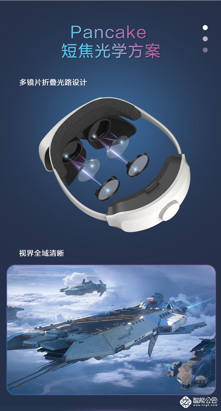 该产品最大的亮点是在新一轮技术驱动下,过去VR常被诟病的厚重,Pancake光学方案的应用得到了改善,做到了可以长时间佩戴的舒适度,Pancake光学方案相较于传统菲涅尔镜光学光学方案,具备纤薄、清晰核心优势。创维PANCAKE 1C搭载的Pancake光学方案,真正意义上实现了轻薄化,主机仅重189g,机身厚度32mm,同时做到视界全域清晰,并支持0-500度近视调节,59mm-68mm无极瞳距调节,采用6DOF+XR2主流配置。