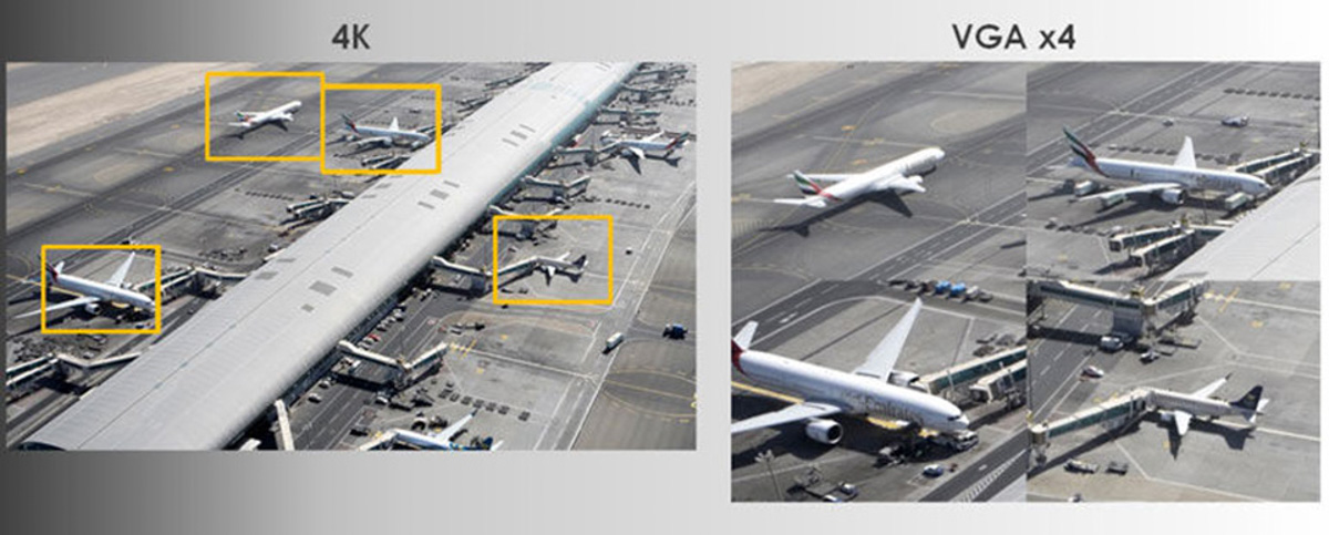 SNC-VB770 上支持了采用一种全新的技术,它能够将 4K 的录制视频裁剪成 4 个 VGA(640 X 480)的图像。通过官方公布的样片显示,SNC-VB770 的裁剪效果还是能够接受的,飞机上的轮廓或者是一些较为明显的细节还是能够看清楚的。这如果使用 1080P 的视频去做,必定会有些吃力,那 720P 肯定更差了。所以从这一点上,还是不难理解 SNC-VB770 上 4K 的必要性。