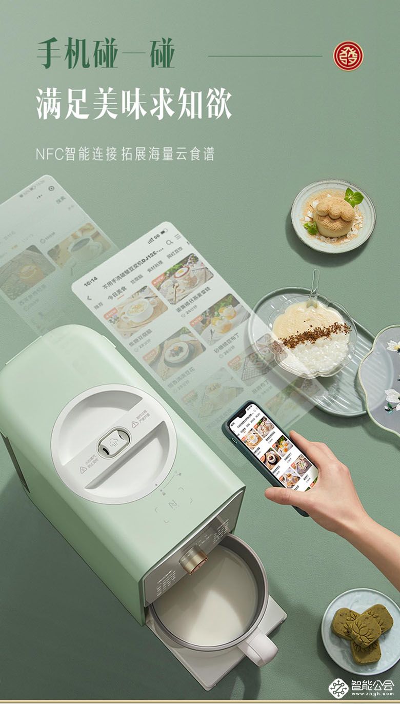 除了颜值过人,“豆福發”还支持NFC食谱拓展,只需手机碰一碰,即可实现手机与机器的连接,预约、智能操作、海量食谱随手可得,满足美味求知欲,下次朋友聚会,悄悄做出一桌子美味,然后惊艳所有人。