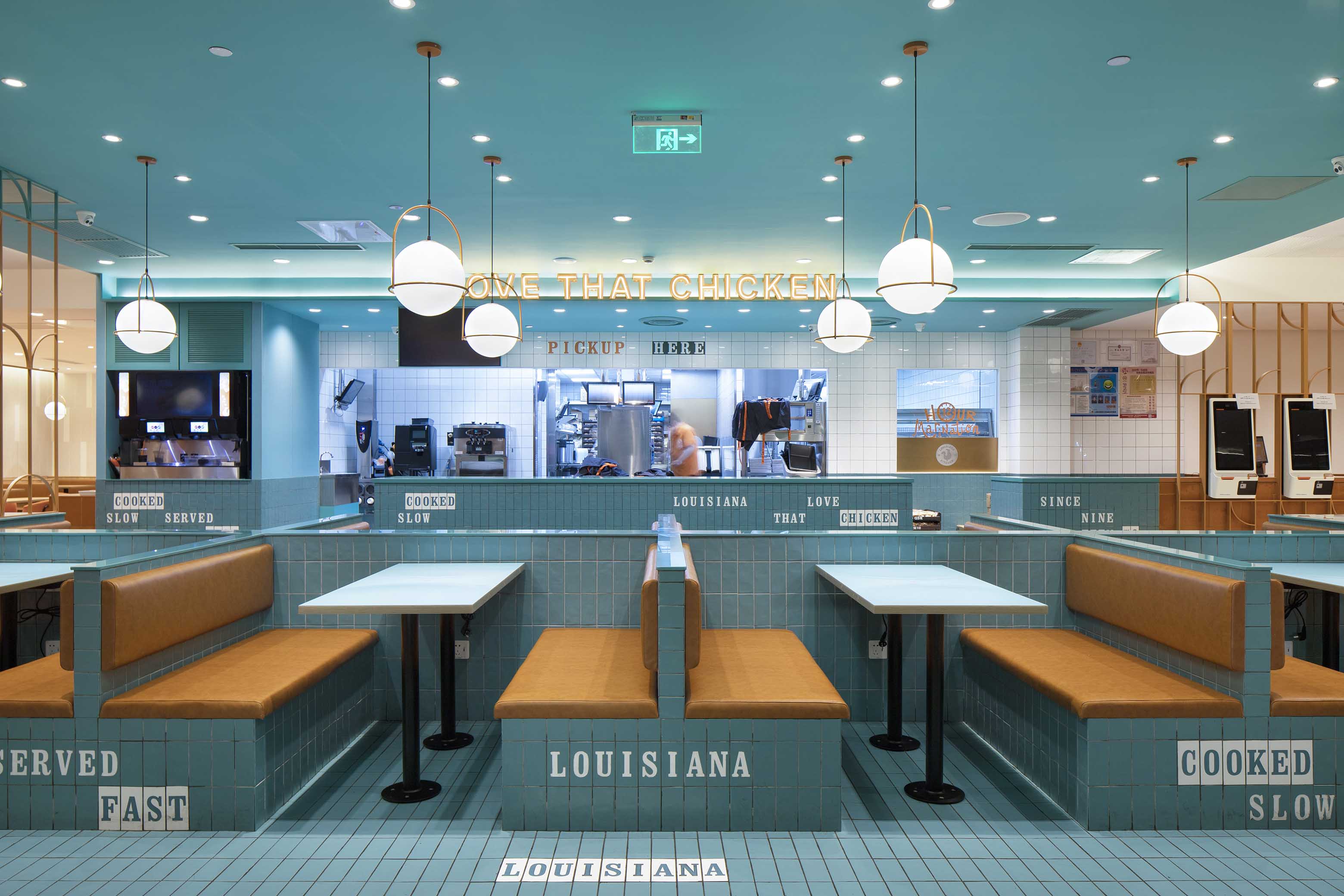 因为客人步入炸鸡店后,就进入了封闭、独特的第二场景,在这里,强势的灯光几乎抢占了人们所有的注意力。