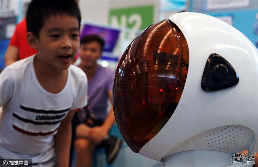 2016年8月27日,在天津?世界侨商名品博览会上,小朋友与智能家居机器人小智互动。据介绍,这款智能家居机器人具有代替门禁、紧急救助、监控、安防、智能管家、娱乐、医疗服务等功能。
