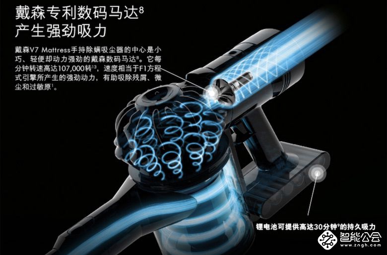 采用戴森专利数码马达,产生更强劲动力,高达30分钟的强劲吸力能够有效吸除残屑、微尘和过敏原;