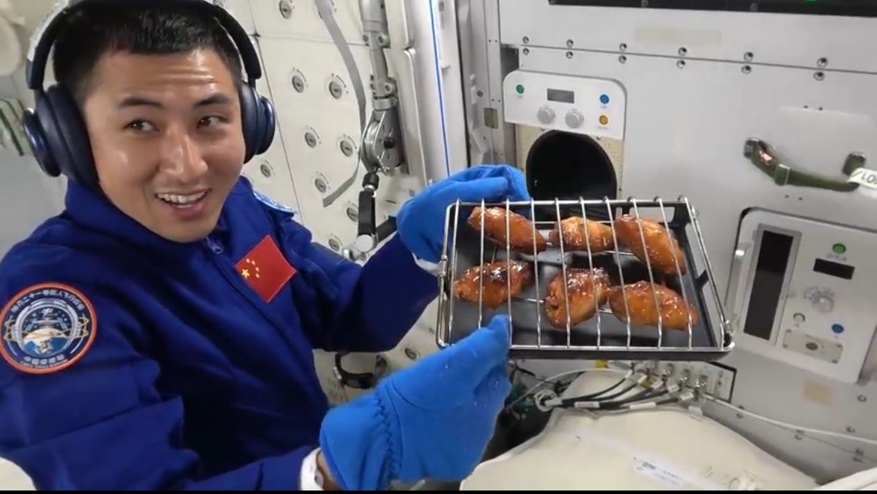 “看看,滋滋冒油,色香味俱全”,11月初,神二十、二十一6位航天员面对从热风烘烤机新鲜出炉的烤鸡翅、牛排,已经两眼放光,脸上全是掩不住的兴奋和期待。“它这个为啥烤出来这么好吃”,这么美味的烧烤,航天员们在太空可是第一次吃,已经吃到停不下来。
