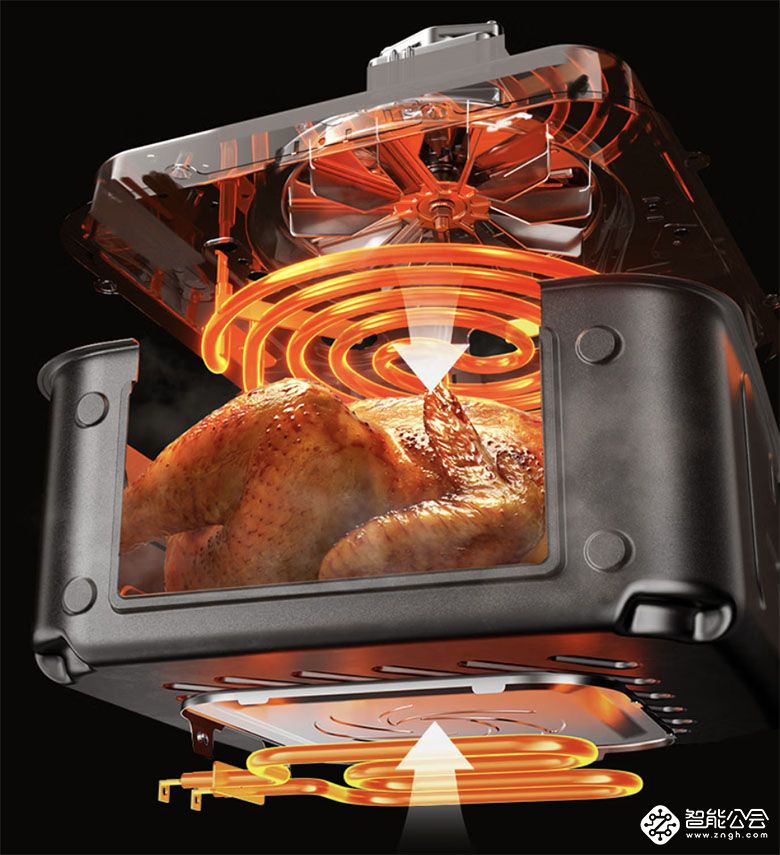 单靠高温还不够,均匀受热才是美味的关键。V589采用上下发热管配合螺旋扇叶,形成涡流式强劲热流,搭配11叶涡轮扇,大幅提升空气循环效率。热风在腔体内高速旋转,全方位包裹食材,确保每一面都能均匀受热。独特的立体架空烘烤结构,减少热风阻力,让热流环流效果更佳,真正做到无需翻面,也能实现四面金黄、外酥里嫩的理想口感。