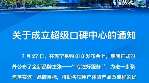 8月14日,苏宁易购超级口碑中心成立。该部门专门负责用户体验、服务质量提升,并直接向集团最高管理层汇报。 818期间,苏宁控股集团董事长张近东前往南...