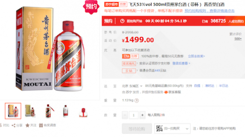 苏宁易购:现在预约 今晚8点抢购1499元飞天茅台